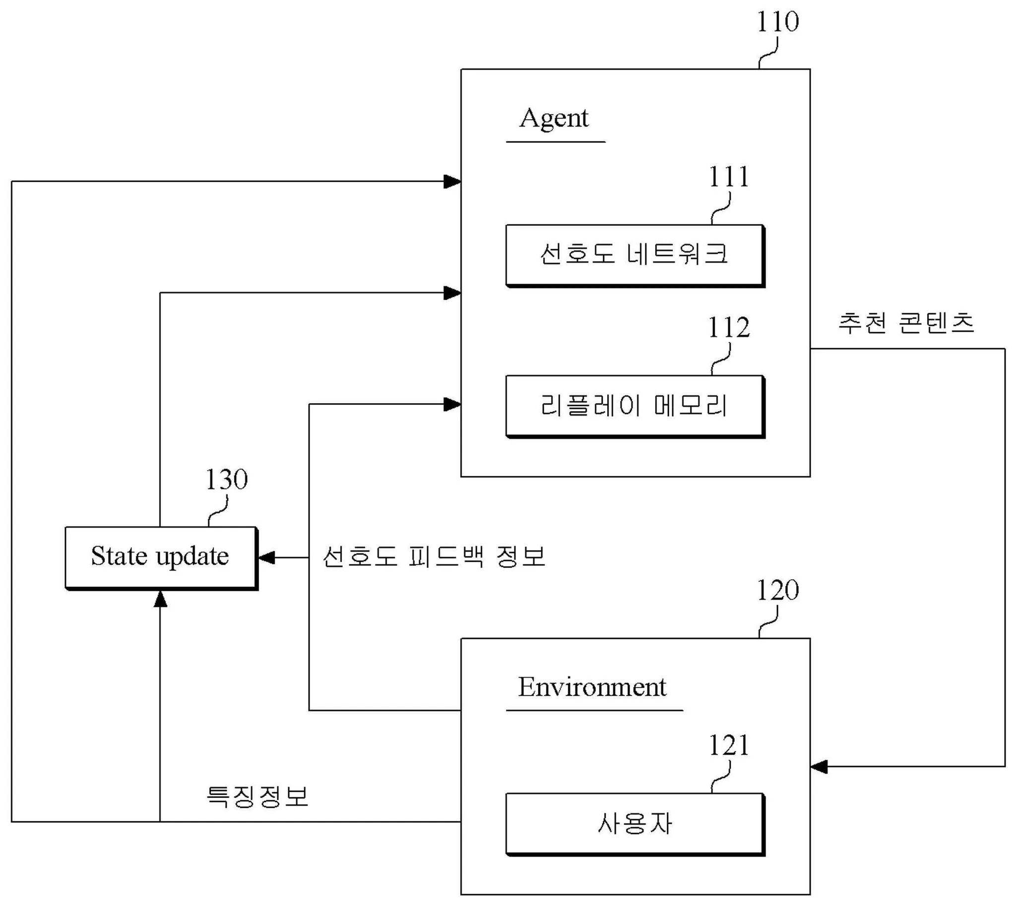 강화 학습 기반으로 사용자의 콘텐츠 선호도와 추천 콘텐츠 특징 정보를 활용하여 선호도 피드백으로 특징 정보를 갱신함