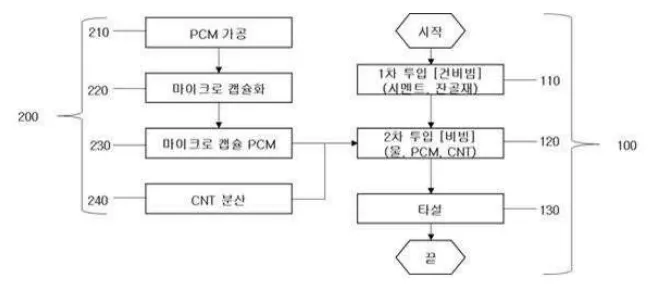 1차로 시멘트와 잔골재를 혼합한 후, 2차로 마이크로캡슐화된 상변화물질과 탄소나노튜브 분산액, 유동화제(SP), 물을 첨가하여 배합함.