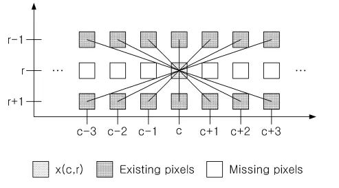퍼지 메트릭 계산부는 입력된 영상 프레임 내에서 누락된 픽셀, 기존 픽셀, 보간 대상 픽셀을 표시하고, 보간 대상 픽셀을 중심으로 에지 방향 각도를 계산함.