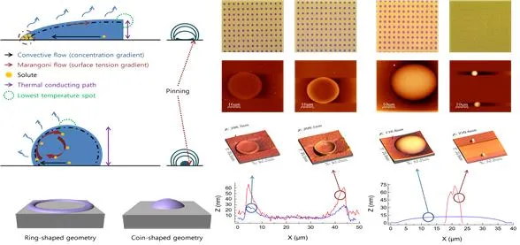 접촉각이 작은 드랍렛의 내부에서는 바깥 방향의 대류 흐름이 우세하여 응고 후 커피 링 효과 (coffee ring effect)가 강하게 나타나는 반면 접촉각이 큰 드랍렛의 경우 내부를 순환하는 마랑고니 흐름 (Marangoni flow)이 강화되어 건조 과정 중 드랍렛의 접촉선 고정 현상을 지연시키고 커피 링 효과가 억제된 소형화된 마이크로닷 구조를 형성함을 확인하였다.